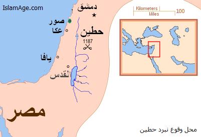 نیروهای صلیبی در تاریخ 23 ربیع الثانی سال 583 هجری (3 ژولای 1187 میلادی) بر روی کوه طبریه مُشرف بر تپهٔ حطین مستقر شدند. حطین منطقهای است فلات مانند که بیش از 300 متر از سطح دریا بلندتر است و دارای دو قلهٔ شاخ مانند است که به آنها شاخهای حطین میگویند.